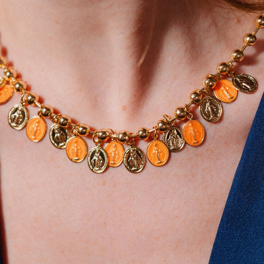 Virgin Mary Necklace - Gold Catholic Necklace with Orange Charms