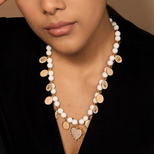White Beads Necklace with Heart Charms | Catholic Jewellry