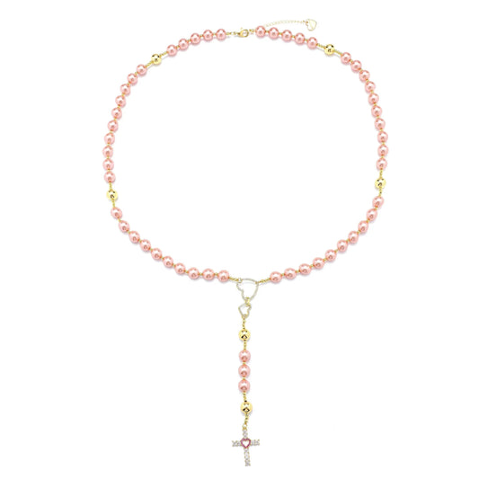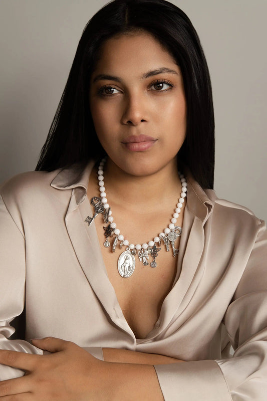 White Beads Necklace with Heart Charms | Catholic Jewellry