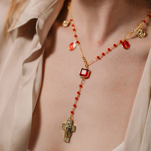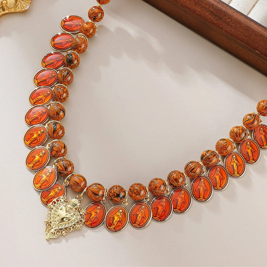 Virgin Mary Necklace - Gold Catholic Necklace with Orange Charms