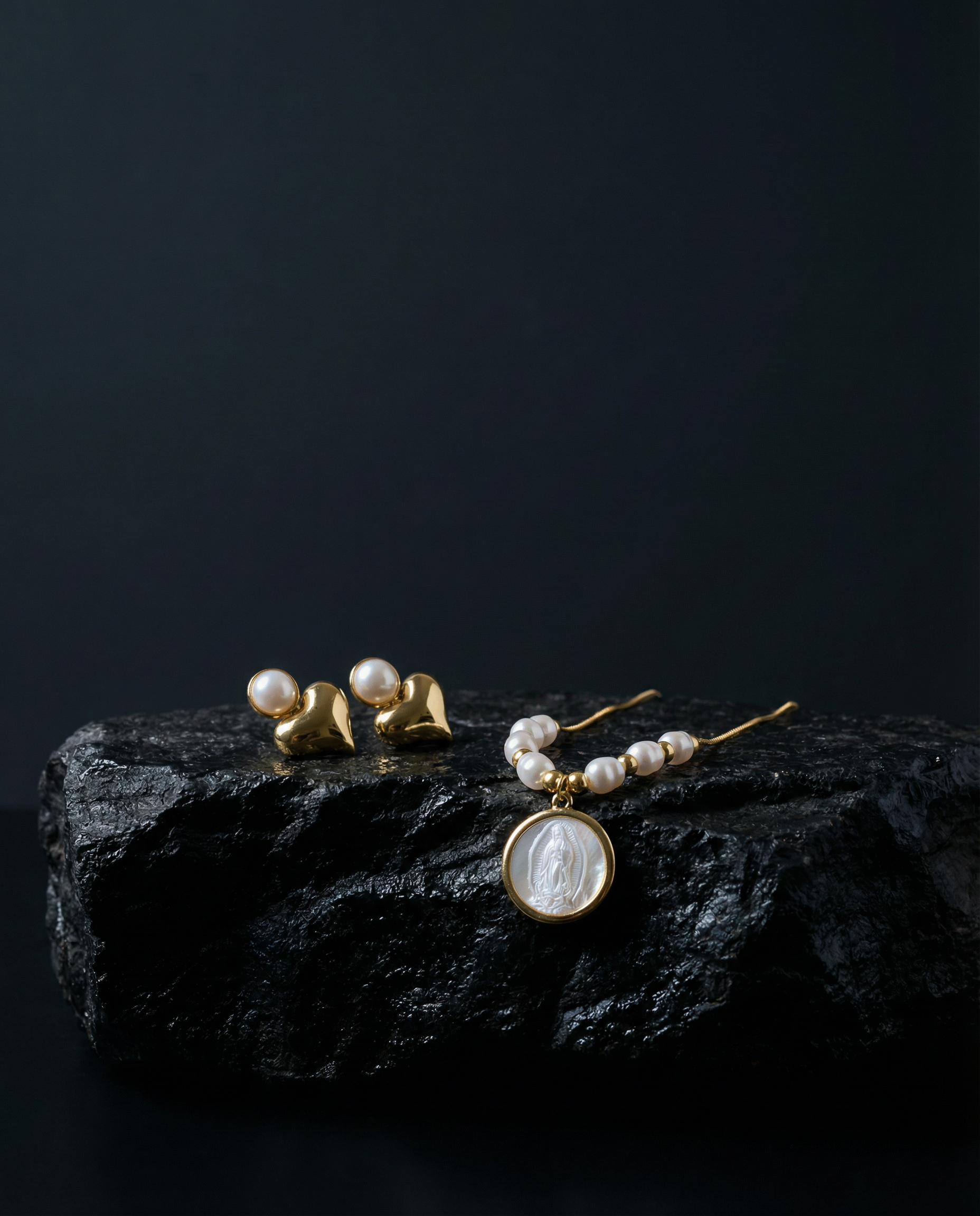 A refined Catholic jewelry set featuring a gold-plated necklace and matching earrings with acrylic pearl details. The necklace combines delicate pearl accents with a Virgin medallion centerpiece, while the earrings pair a classic pearl stud with a polished heart drop for a soft, feminine finish.
