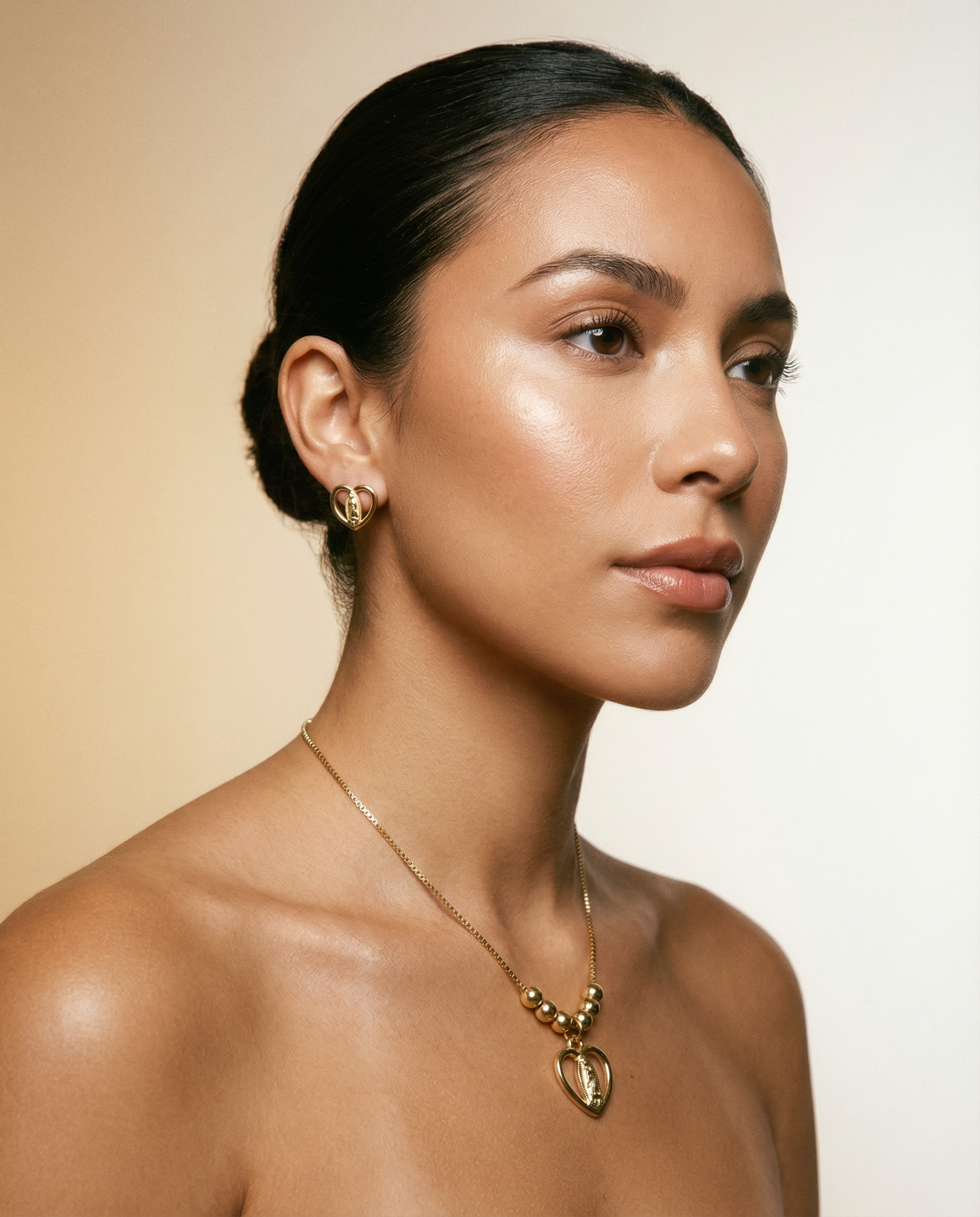 The necklace, with its details of golden spheres, adds a contemporary and light touch, while the earrings replicate the symbol in a clean and refined version that illuminates the face without being overwhelming.